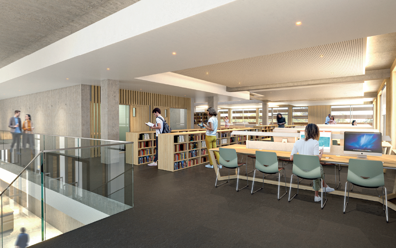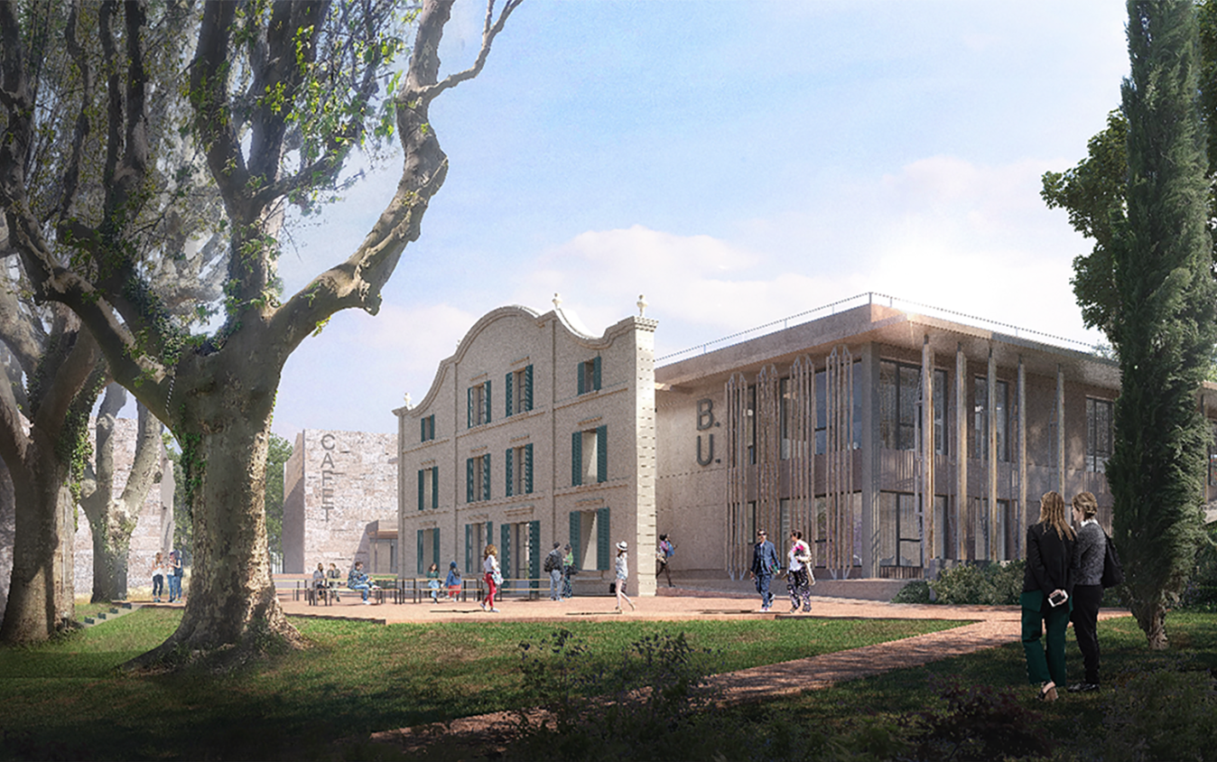 Le bâtiment de la cafétéria et de la logistique s’installe dans un quatrième peigne, et la Bibliothèque Universitaire fait l’objet d’un traitement spécifique : seule la façade principale de l’ancienne Bastide est conservée comme un décor de théâtre, et se déploie à l’arrière le bâtiment qui contient une grande salle de consultation / lecture à l’étage.