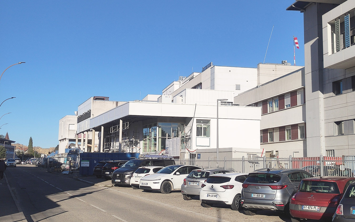 Le projet se développe le long de l’avenue Alphonse Daudet, la partie neuve en continuité des locaux existants trouvant sa place au Sud/Ouest du site dans l’espace disponible le long de la pédiatrie. Disposée ainsi, la construction nouvelle au rez-de-chaussée haut abrite l’UHCD et dégage un espace au niveau de l’avenue (rez-de-chaussée bas) mis à profit pour créer le hall d’entrée principal des consultants valides et du public. Confortant le scénario proposé, le hall d’entrée est desservi par un parking arrêt-minute créé au droit du projet et en continuité un parvis qui permet d’identifier clairement l’accès piétonnier/PMR principal du bâtiment des Urgences.